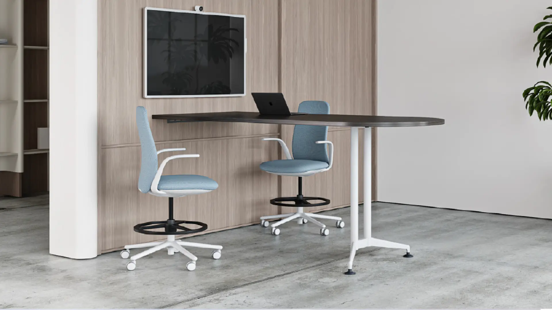 ZIA Media Tables combine the elegant leg design of the ZIA Collection, with several additional top shapes to help enhance your collaboration areas. The custom wall mount feature allows for effortless media integration.